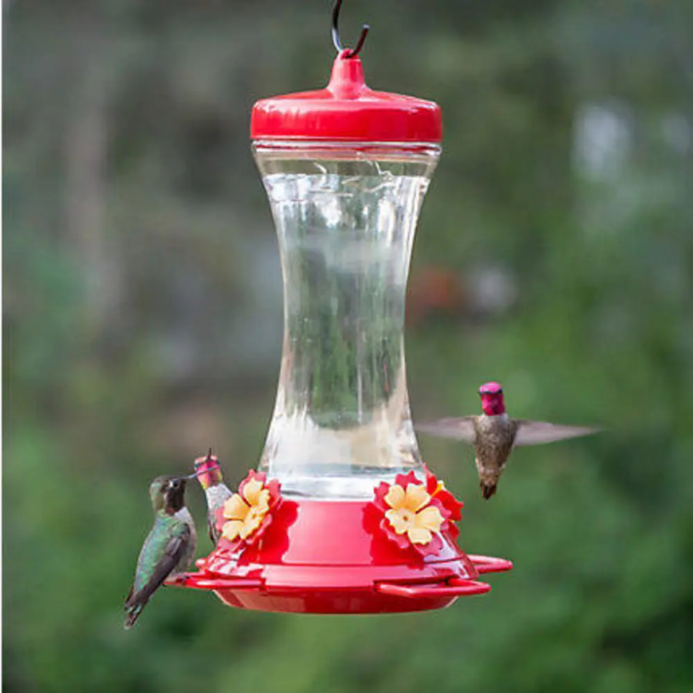The Perky-Pet Adjustable Perch Glass Hummingbird Feeder features a reversing funnel cap (makes filling and cleaning easy), a tempered clear glass nectar container, four sculpted flower feeding ports with bee guards, and a 20 oz nectar capacity.