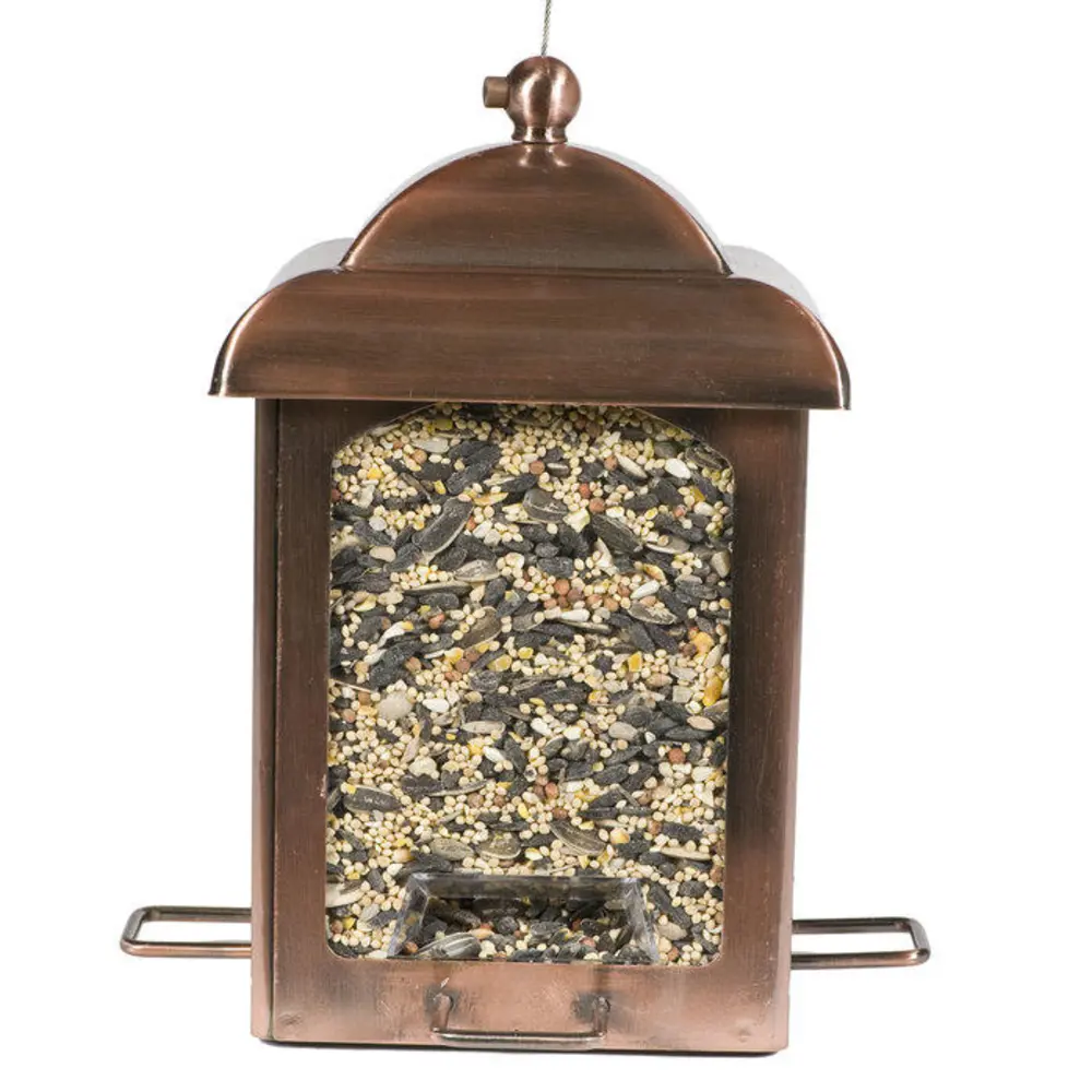 The Perky-Pet Antique Copper Finish Lantern Feeder holds up to 2.5 lb of seed, has 4 feeding stations, bird-preferred U-shaped perches and an antique copper finish. The rounded lid design gives it a charming and softer appeal. This feeder utilizes the Sure-Lock™ cap system to keeps squirrels out and allows birds to feed.