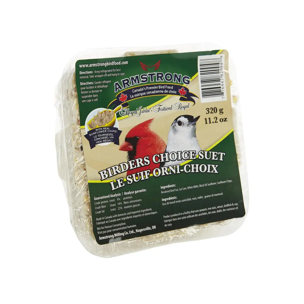 Beef tallow based snack for wild birds - full of high energy nutrients! Liquid beef fat is blended with a mix of grains & seeds and made into a slim cake. Armstrong Birder's Choice Suet uses black oil sunflower & sunflower chips to attract a wider variety of wild birds. Best fed during colder weather months.