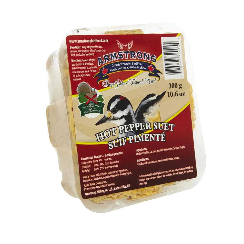 Beef tallow based snack for wild birds - full of high energy nutrients! Liquid beef fat is blended with a mix of grains & seeds and made into a slim cake. Armstrong Hot Pepper Suet is made with liquid hot pepper to deter squirrels (who can taste the hot pepper when wild birds cannot). Best fed during colder weather months.