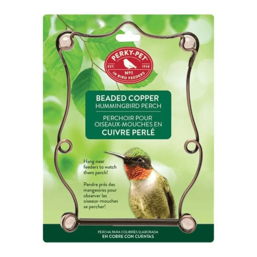 The Perky-Pet Beaded Copper Hummingbird Perch keeps birds in your yard longer by giving them a place to roost while they wait for an open space at your busy bird feeder. As a great addition to your hummingbird feeding supplies, you'll love the look of this copper swing and its rose-tinted accent beads. Hang with a hook or cord near your feeders and you'll soon see the iridescent beauties perched and enjoying the view. The size of this swing means that not only can your hummingbirds enjoy having a place to rest, but your other feeder birds can as well. Also, since you get to determine the exact placement of the Perky-Pet Beaded Copper Hummingbird Perch, you can move it to areas that allow you to take great pictures of your visitors. Birds sitting on the perch are perfectly staged for photos, and they tend to linger there longer. For your convenience, the plastic-coated perch is easy to clean. Meanwhile the copper frame is powder-coated to ensure resistance to rust.