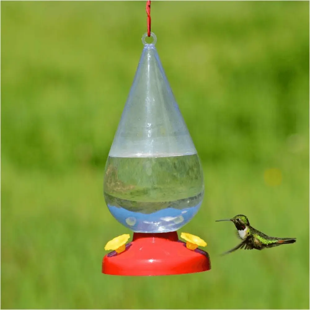 The Perky-Pet Dew Drop Hummingbird Feeder features 3 feeding ports and holds 32 fl oz of nectar. The unique droplet shaped feeder will add a unique touch to any outdoor space. Feeder base is bright red to attract hummingbirds, while the clear, shatter resistant acrylic reservoir will make monitoring nectar levels easy. Feed your hummers in style with this unique feeder. The dew drop shape unscrews easily from the base of the feeder for quick and easy cleaning and filling. Built in hanger at the top of the plastic reservoir makes hanging a breeze too.