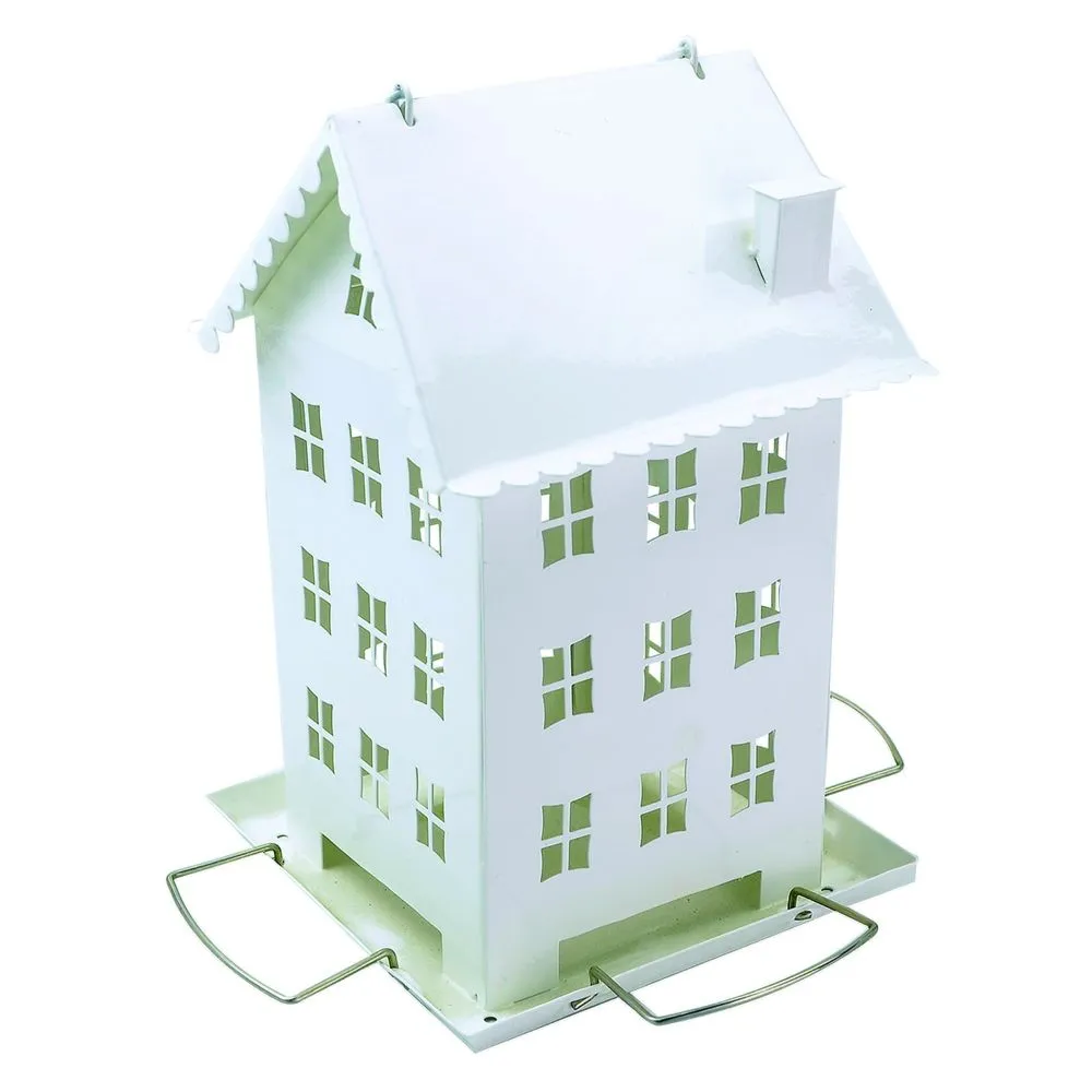 Bring the quaint farmhouse life to your backyard birds with the Perky-Pet Farmhouse Feeder. This charming white feeder is styled to resemble an old-fashioned farmhouse, complete with a gabled roof and plenty of windows. In addition to adding aesthetic appeal, the numerous windows allow you to easily monitor seed levels. For your convenience, the roof is removable to make filling and cleaning easy. To open, simply remove the hanging hook and pull off the roof. The translucent windows also slide out of the metal frame to allow for easier cleaning. Plus, the all-metal construction ensures that this feeder is built to last. Birds will love visiting the Perky-Pet Farmhouse Feeder thanks to its four bird-preferred U-shaped perches, which allow multiple birds to feed on each side. The feeder is also able to hold up to 2.8 lb of mixed seed or sunflower – a favorite for many backyard birds. In addition, drainage holes prevent water from pooling inside the reservoir to ensure seed remains fresh and dry.