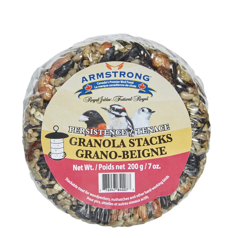 Quick & easy way to feed birds - just unwrap & hang! Seed ring made with the right seeds to attract Woodpeckers and fruit & nut-loving birds. Uses same formulation as Armstrong Persistence bird seed. Birds can cling and enjoy a snack - up to 4 stacks can fit onto Armstrong Granola Stacks Feeder.