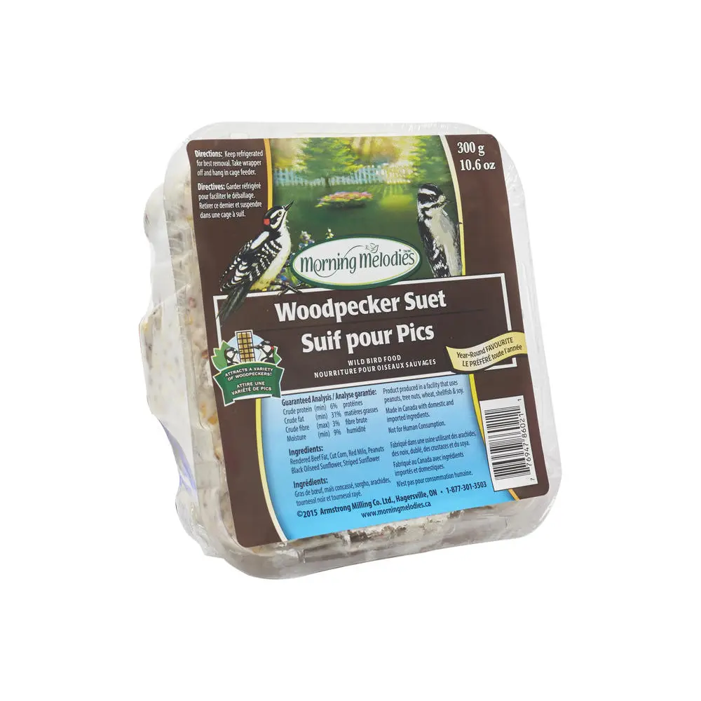Beef tallow based snack for wild birds - full of high energy nutrients! Liquid beef fat is blended with a mix of grains & seeds and made into a slim cake. Morning Melodies Woodpecker Suet is made with ingredients woodpeckers love. Best fed during colder winter months.
