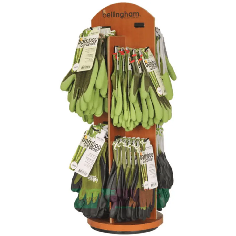 The Bellingham Bamboo Gardener Wooden Carousel Countertop Display includes 96 pairs of Bamboo Gardener bamboo / rayon work gloves. Two different styles included in the display - C5301 and C5371.