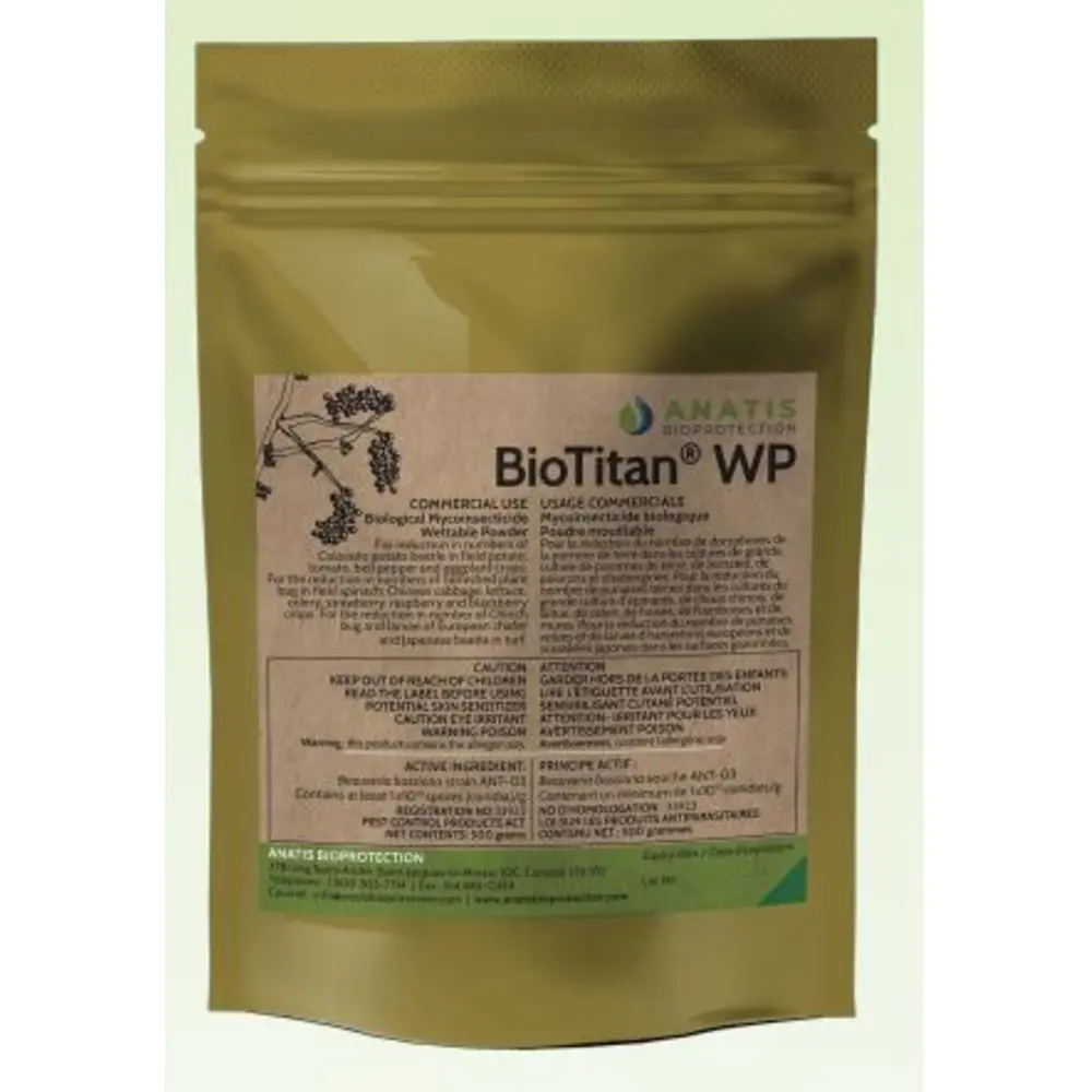 BioTitan WP is the first mycoinsecticide registered for turf in Canada. The active ingredient is Beauveria bassiana strain ANT-03 that was found and developed in Canadian soils. Currently BioTitan WP will be sold in a wettable powder form for the prevention of chinch bugs and white grubs in all types of grass in Canada. Can be applied with every type of spraying equipment. 500g package.
