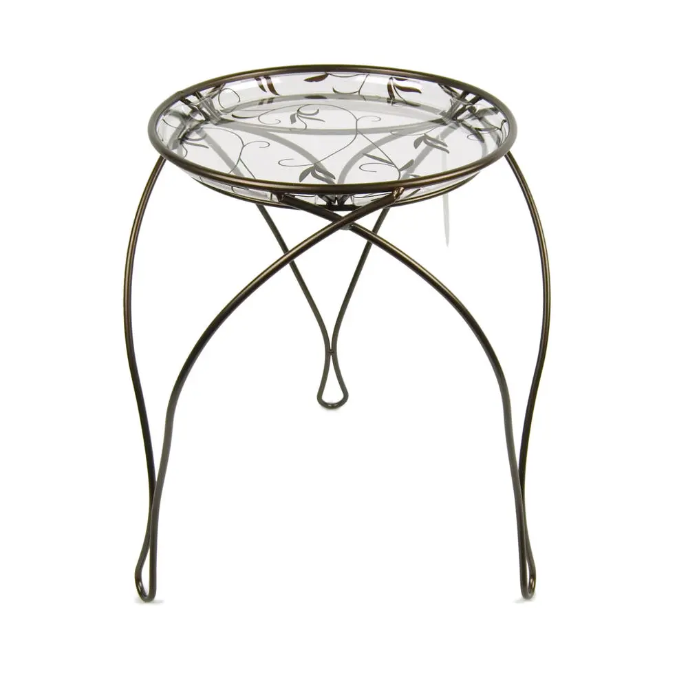 The elegance plant stand features a decorative printed pattern on the saucer that complements the lines of the plant stand.
