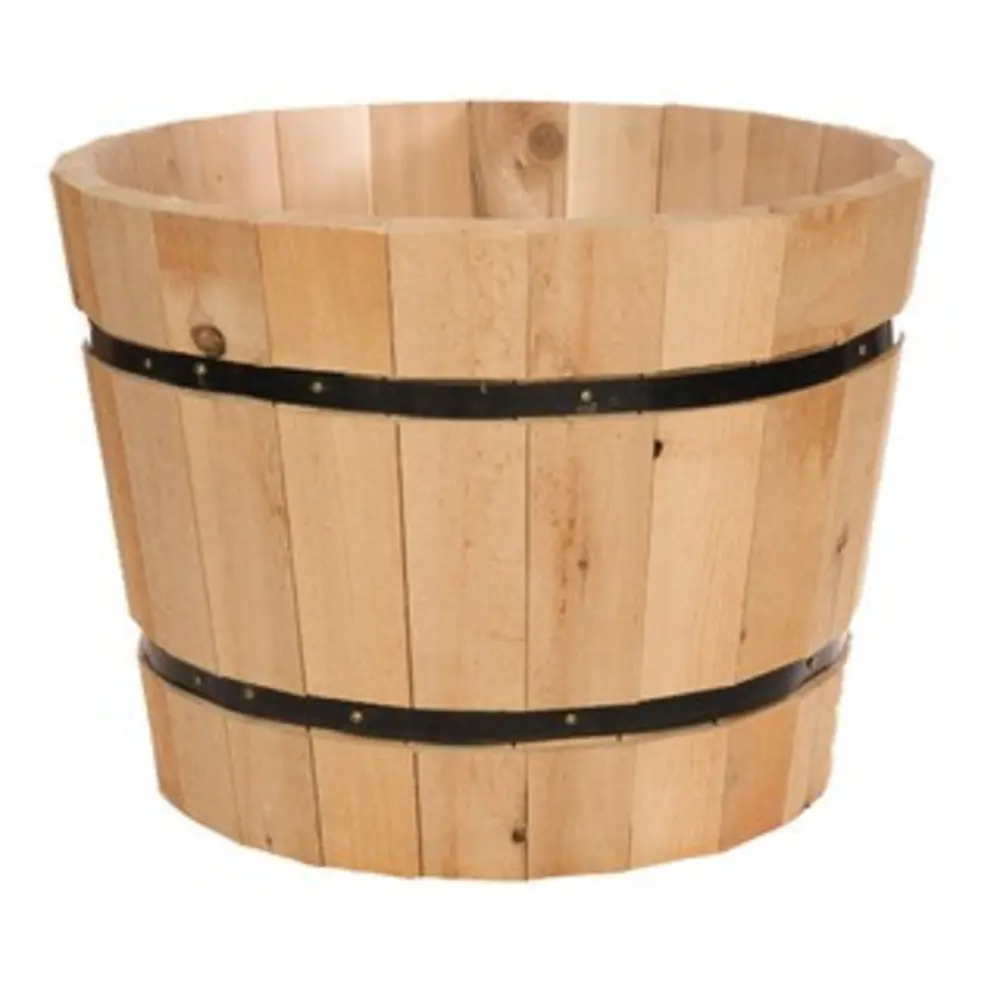 With black metal bands, this handsome cedar barrel is great for rustic country displays.