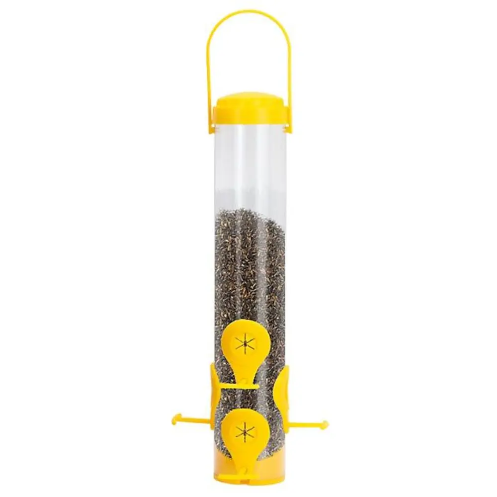 Attracting goldfinches, purple finches, redpolls, and siskins to your yard with the Perky-Pet Finch Feeder. This feeder includes flexports, which offer benefits for birds and you. The flexible rubber port cover is uniquely designed to prevent seed clogging and is the perfect size for small finch seed. The design also allows birds to feed in a more natural position. With 1.5 lb of Nyjer on offer, your backyard birds will be in good supply. Plus, the bright yellow accents on this tube feeder are sure to catch the eye of thistle-eating birds as they pass by.