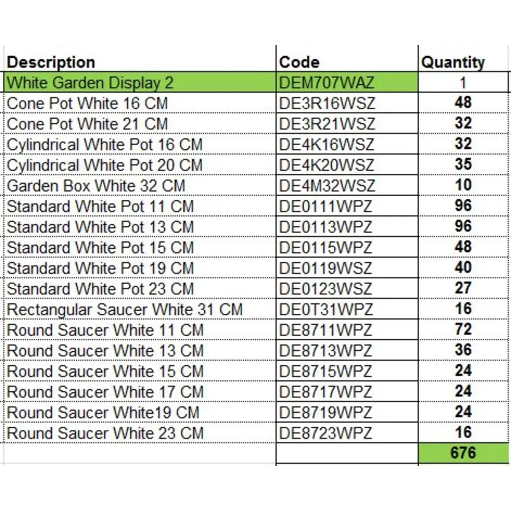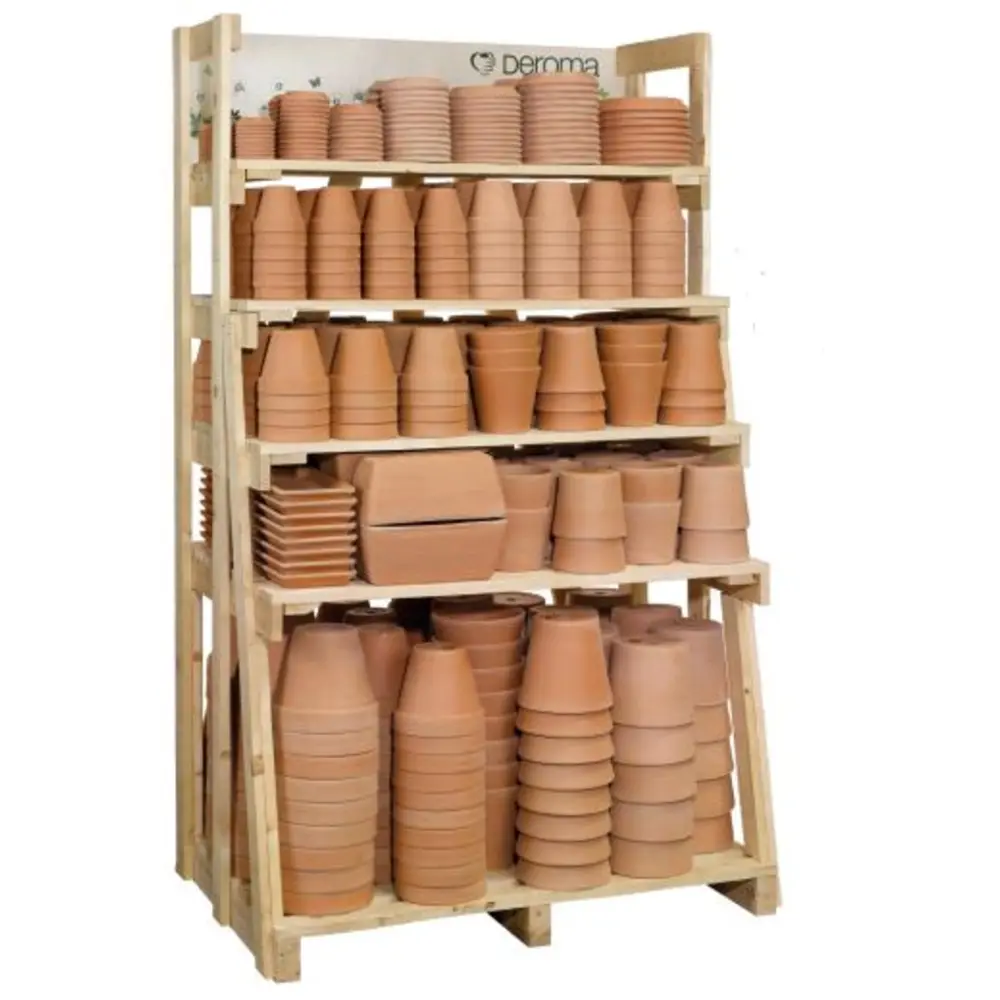 Retail-ready mixed pallet display of terracotta Deroma pots and saucers. Contains 676 pieces. Deroma products are available for fall booking, inventory restocked once yearly.