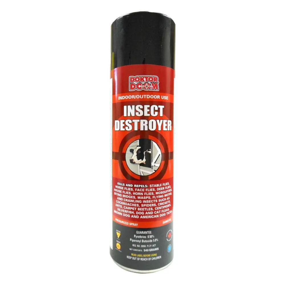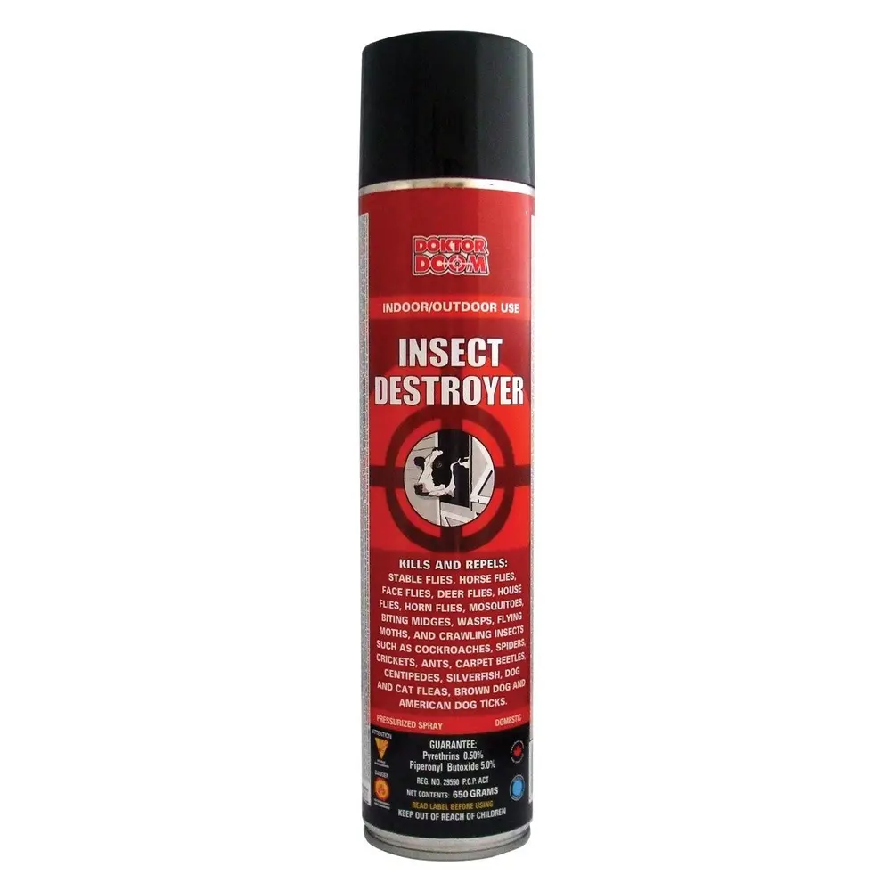 Doktor Doom’s Indoor Outdoor Insect Killer kills and repels table flies, horse flies, face flies, deer flies, house flies, horn flies, mosquitoes, biting midges, wasps, flying moths, and crawling insects such as cockroaches, spiders, crickets, ants, carpet beetles, centipedes, silverfish, dog and cat fleas, and brown dog and American dock ticks.
