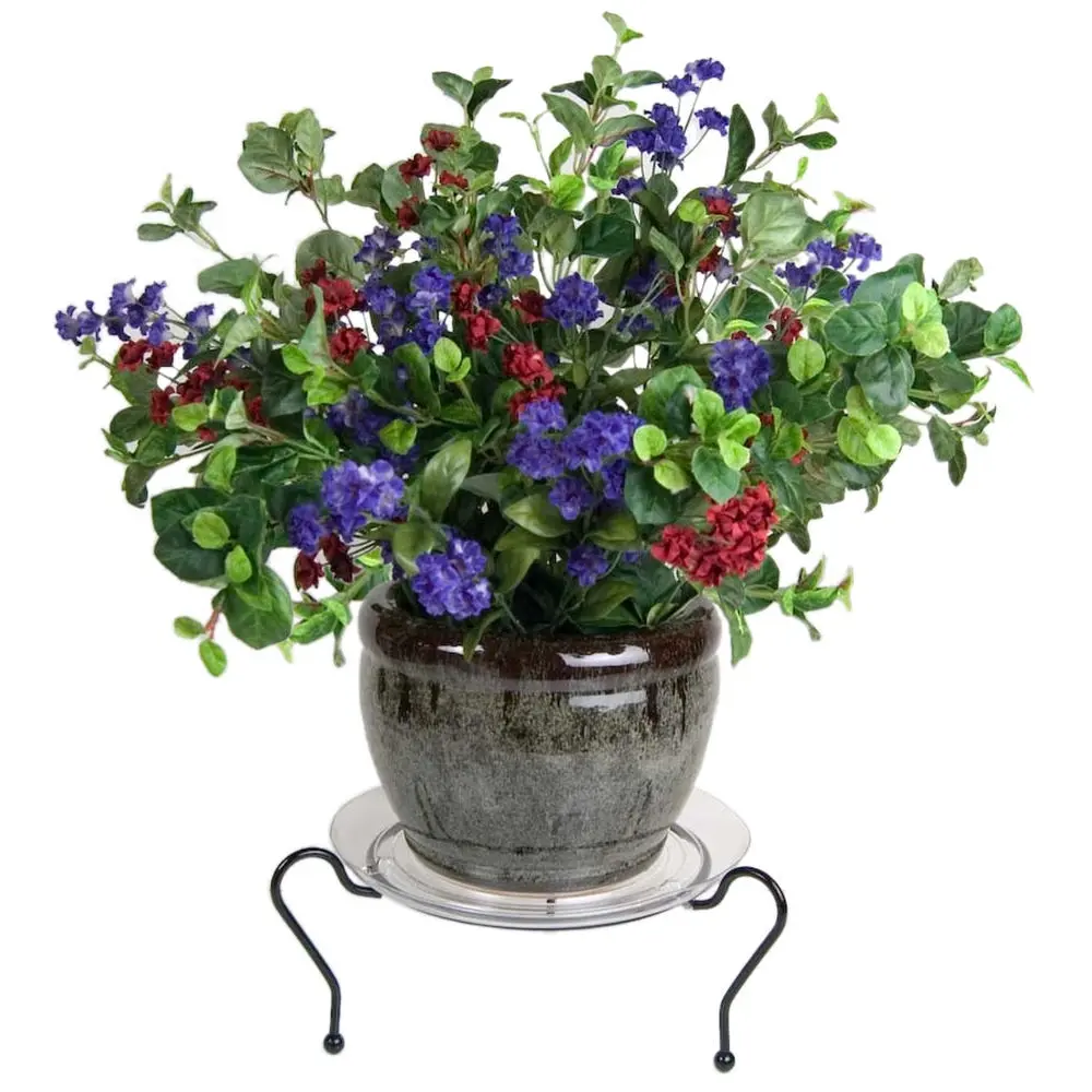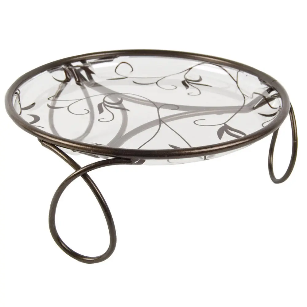 Decorative 10" printed saucer on a metal stand, perfect for displaying plants on a tabletop. 4" tall, available in black or dark bronze.