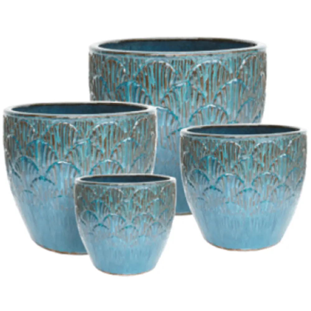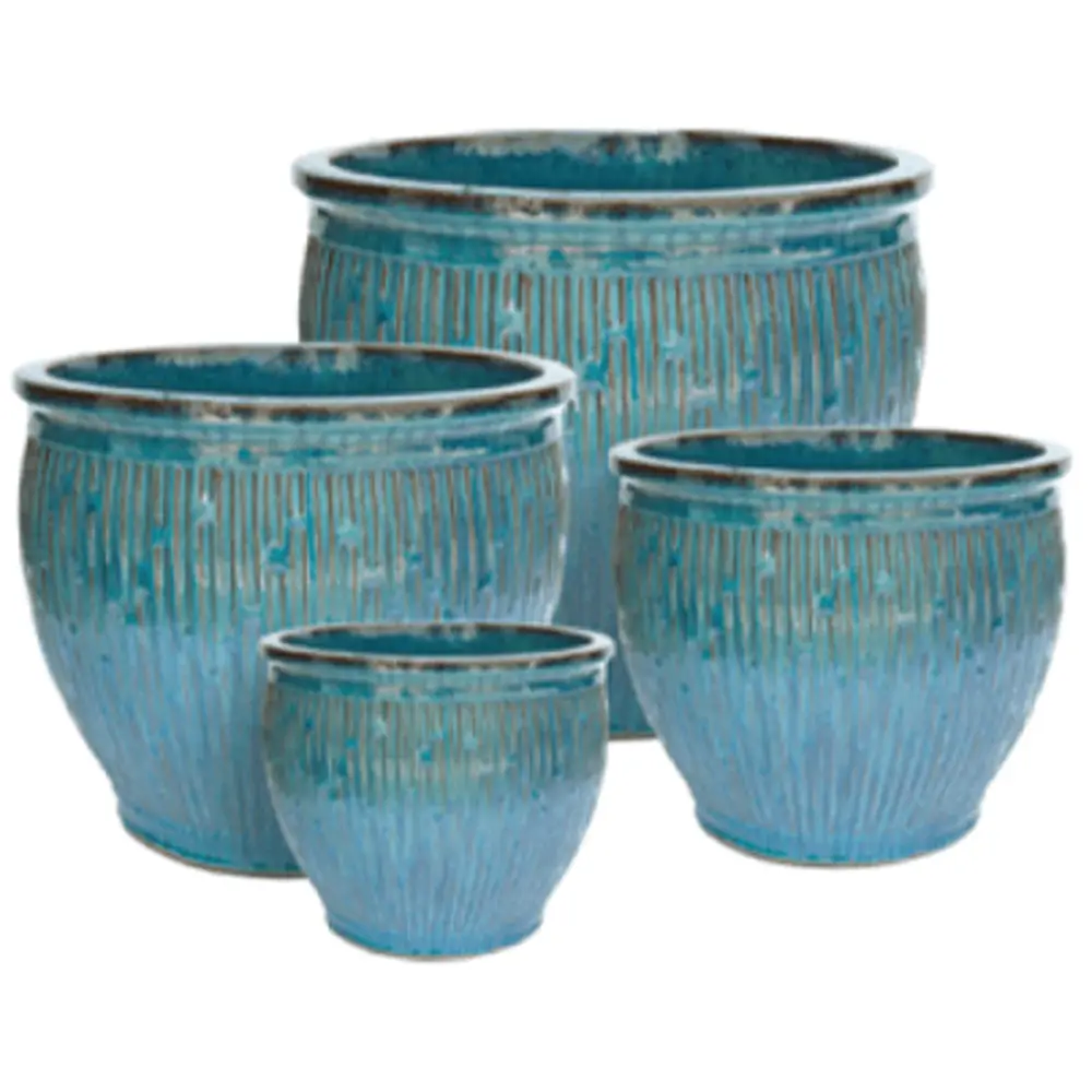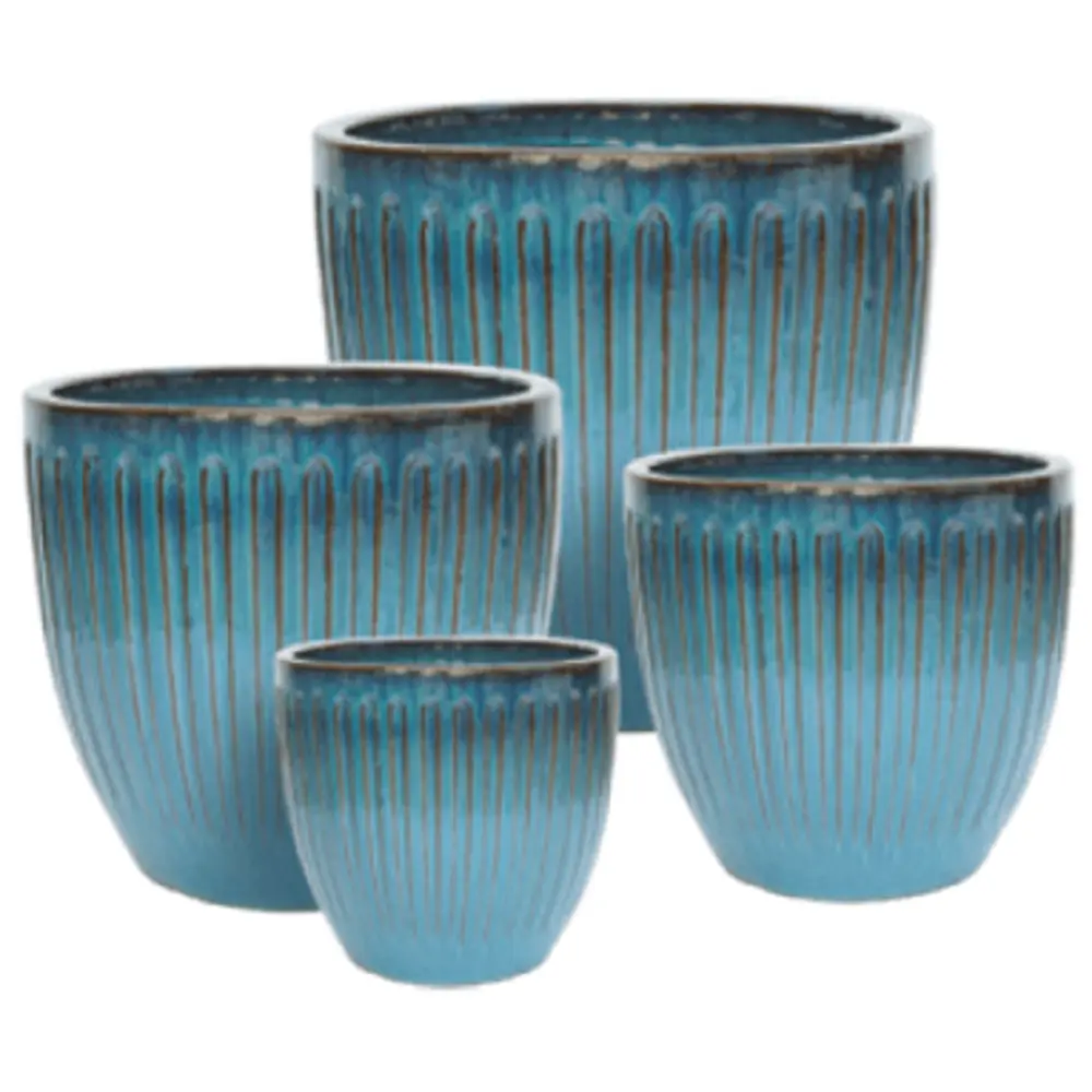 Mixed pallet display of glazed ceramic pots suitable for indoors and outdoors from Jackson Pottery. Each unit contains 40 pieces. Contains an assortment of Stria, Rain and Bondi planters in Fireworks Green. Detailed product breakdown with sizes, colours and suggested pricing can be found in the product images.
