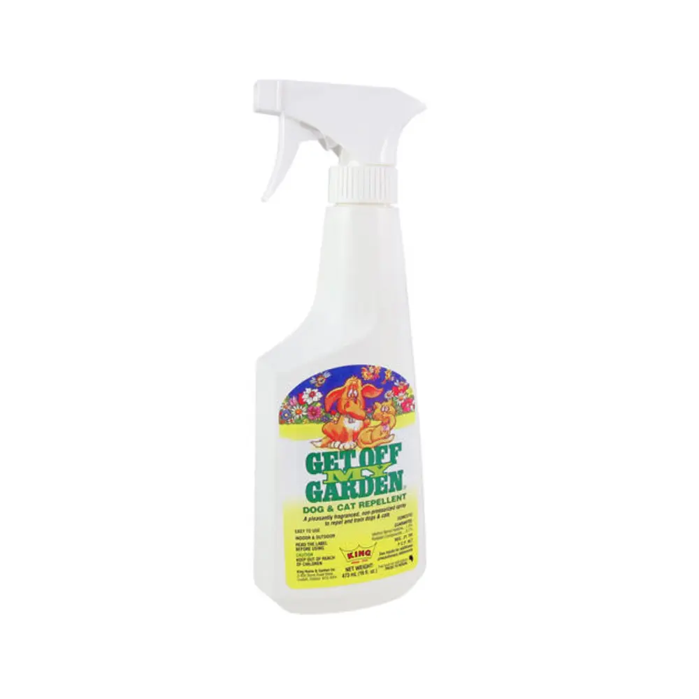 Canadian made Get off my Garden spray has a pleasant fragrance that makes it suitable for indoor use. It can also be used outdoors in localized areas, but must be reapplied after rainfall. It repels and confuses your dogs and cats sense of smell. King products are available for fall booking, inventory restocked once yearly.
