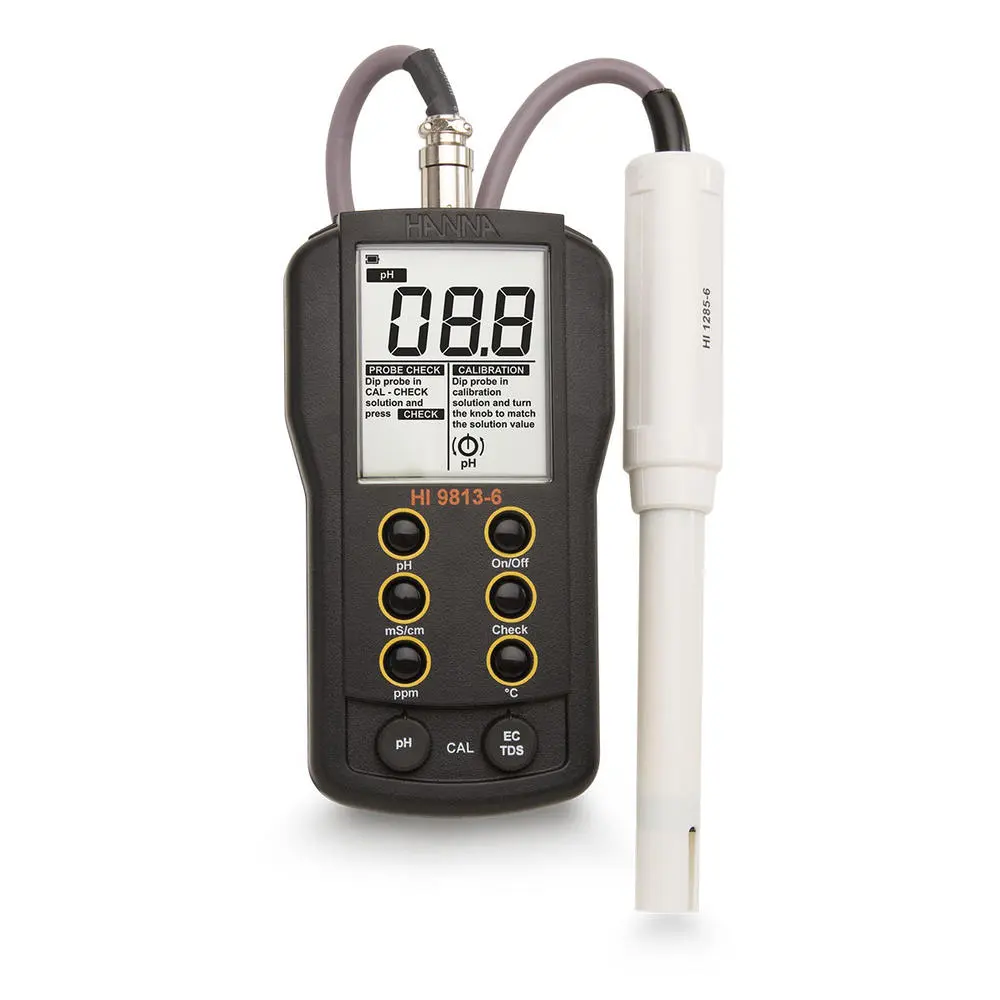 The HI9813-6 portable meter features a large LCD which displays either pH, EC, TDS or temperature readings along with tutorial instructions. The pH readings are displayed with a 0.1 resolution and an accuracy of +/-0.1 pH while the EC and TDS readings are displayed with a 0.01 μS/cm and 1 ppm (mg/L) resolution and 2% full-scale accuracy. The EC range of the HI9813-6 is from 0.00 to 4.00 μS/cm and TDS is from 0 to 1999 ppm. The temperature correction coefficient (β) is fixed at 2 %/oC and allows for automatic temperature compensated measurements of EC and TDS. The HI9813-6 is a basic pH/EC/TDS meter that is calibrated manually to a single point with the use of two trimmers. pH is calibrated to pH 7.01 while EC/TDS is calibrated to either 1.41 μS/cm (1413 μS/cm) or 1500 ppm. The LCD screen has battery life indicator as well as on-screen tutorial messages. The supplied HI1285-6 probe is a polypropylene body, amplified pH electrode with a built-in EC/TDS and temperature sensors. The amplifier for the pH electrode prevents interference from humidity and electriCalibration noise from common sources including from motors, ballasts or pumps. The HI9813-6 is a versatile meter for the agriculture, greenhouse and hydroponics industries. The HI9813-6 meter also offers the Calibration Check™ feature that alerts the user to a problem with a pH electrode. This feature is important for customers that calibrate only to pH 7.0; if there is a fracture on the pH glass of the electrode, the pH meter will always display pH 7.0 regardless of the solution being measured. This can be disastrous for the person that calibrates at pH 7.0 and takes readings of samples with an expected pH of 7.0. The user will never be aware that there is a problem with the electrode. This can result in inaccurate pH measurements, which for a greenhouse can affect the growth of the plants. Placing the HI1285-6 pH/EC electrode in the HI50021 Calibration Check™ solution helps users determine if the probe needs to be calibrated, cleaned or replaced. When the probe is placed in solution the user presses the "Check" key. The meter runs Calibration Check™ diagnostics and will display either "Probe is OK" or "Clean Probe and Calibrate". If the reading is around pH 4.0 when the probe is placed in the solution then the probe is broken and needs to be replaced. Hanna Instrument products are restocked regularly throughout the year.