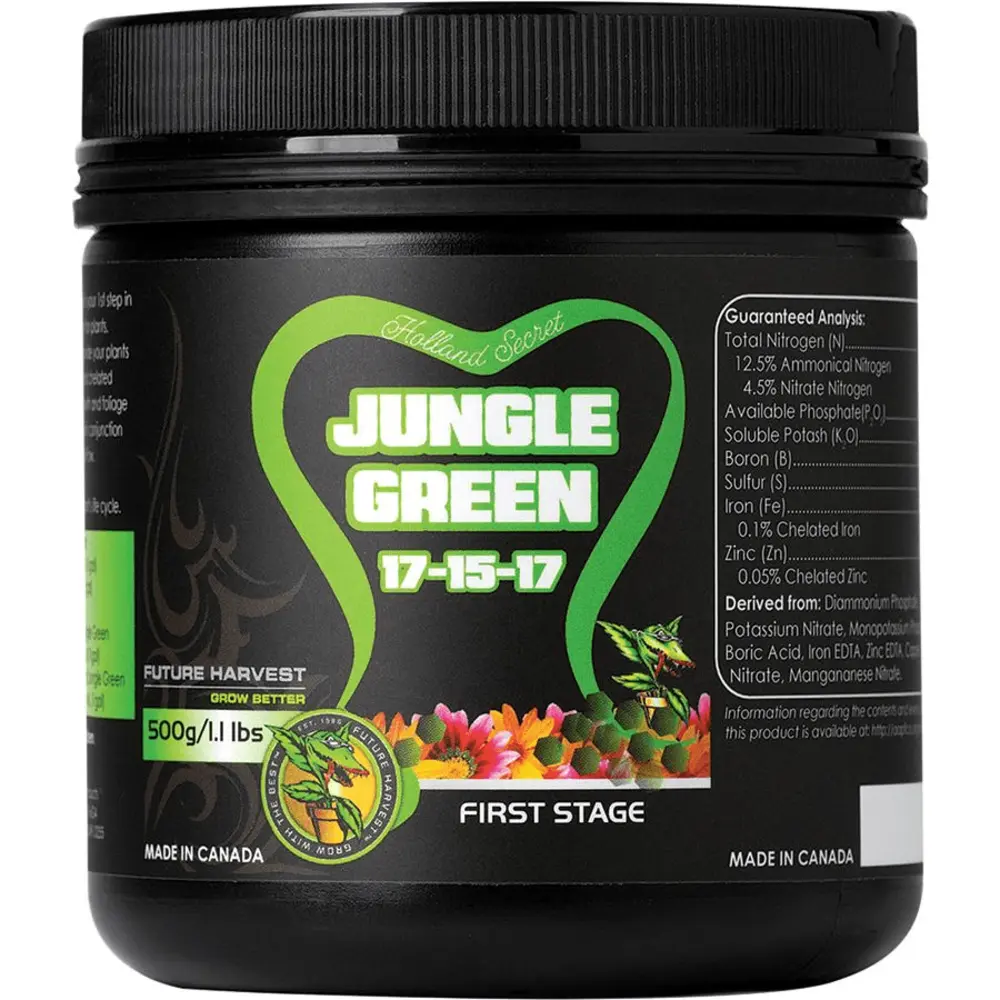 Jungle Green 17-15-17 is designed for use during week 1-4 of your veg cycle. It delivers fast acting nutrition for vigorous growth. Applications: Soil, Soilless, Coco, Rockwool, Hydroponics, and Aeroponics Future Harvest products are available for fall booking. Inventory is restocked once yearly, with potential for repeats based on order minimums.
