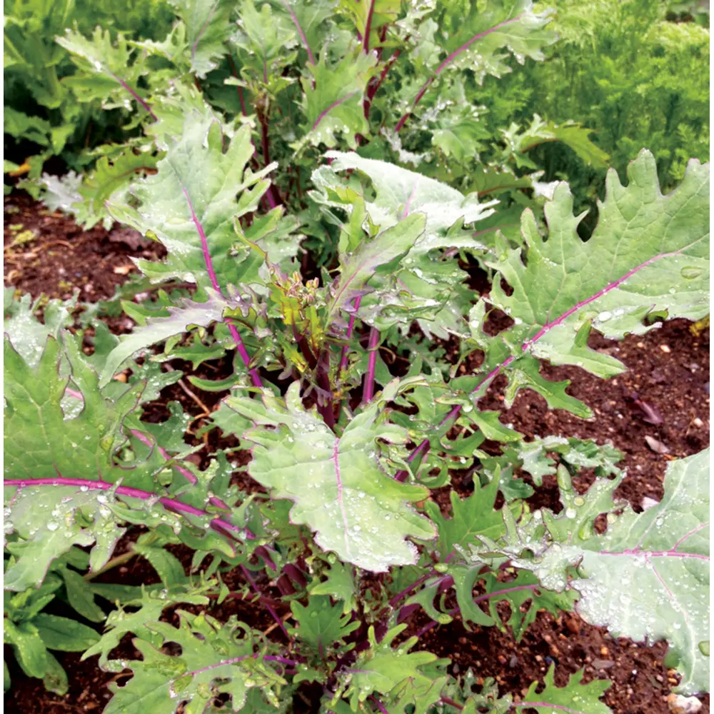 25 days baby, 50 day mature. A popular variety with flat, toothed, dark green leaves and red-purple veins and stalks. Leaves are more tender compared to other kales.