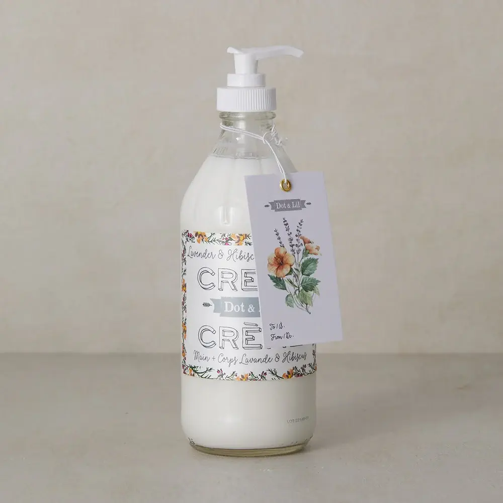 Dot and Lil hand + body cr?mes are made with a rich and emollient shea butter and coconut oil formula that deeply moisturizes and protects skin. An elegant glass bottle that matches our liquid soaps and milk baths. Comes with a beautiful gift tag with floral illustration. Lavender scent is fresh and herbal, straight from a garden flower bed! A very soothing and relaxing scent.