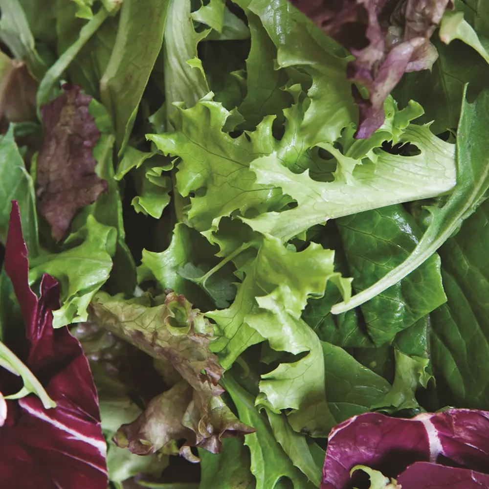 A mixture of different salad greens with exotic colours, textures and flavours. This high quality mixture has been selected to offer a superb blend of flavours and colours.