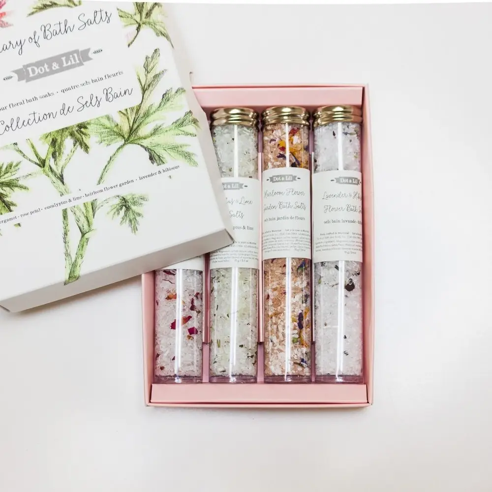 This gift set comes in a beautiful 2-piece gift box with 4 large vials of bath salts, which you can use individually or mix and match to create a custom experience. Each tube has real flower petals for a custom-blended botanical bath.