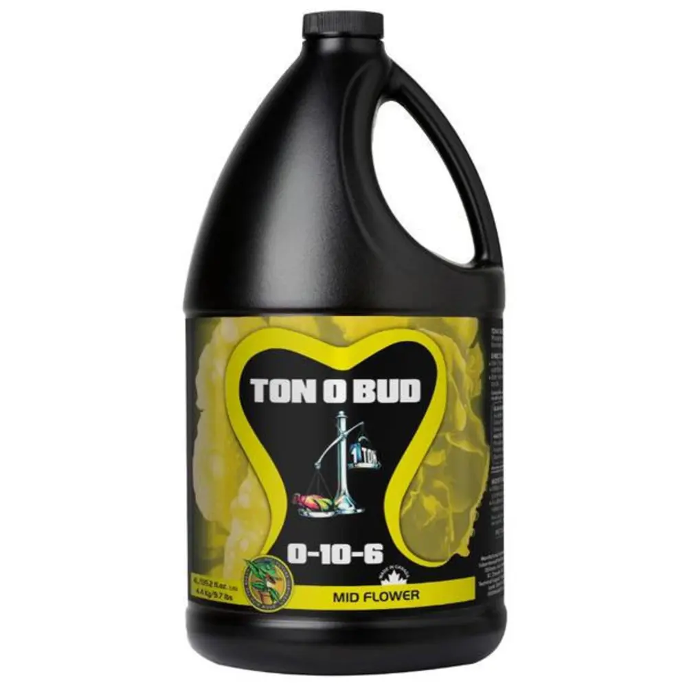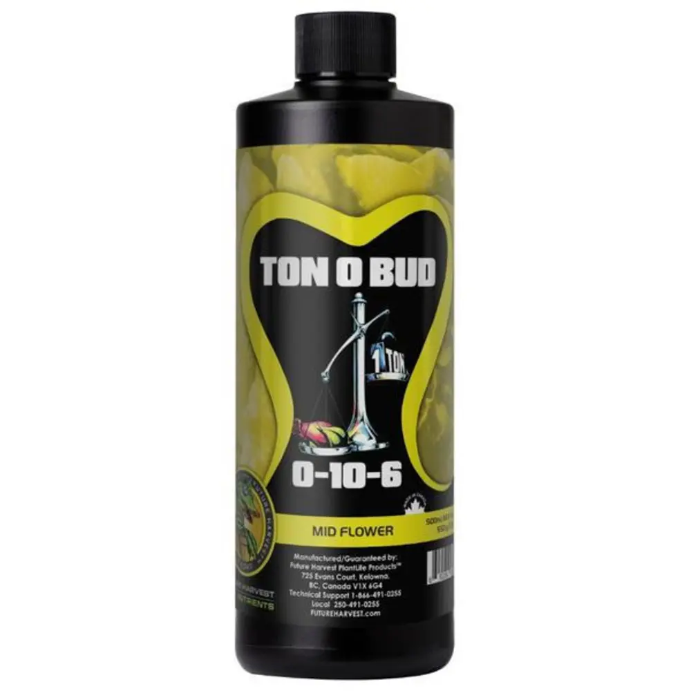 Ton O Bud is one of the best selling, if not the best selling additive in Future Harvest's extensive additives range. It is globally recognized and has a proven reputation as one of the most powerful plant enhancing additives on the market. Ton O Bud is concentrated P-K (phosphorous and potassium) additive designed to pack bulk onto flowers and fruits during the middle stages of a flowering cycle. The benefits are plain and simple, higher end yields and drastically increased flower set, meaning more flowers are present, with tighter and more compact density, without compromising quality and flavour. Key Features: Does not significantly add to EC levels unlike most P-K products, works alongside and in addition to all industry leading manufacturer feed schedules, produces rapid, visible results, works for all grow media and methods, tried and tested worldwide. Future Harvest products are available for fall booking. Inventory is restocked once yearly, with potential for repeats based on order minimums.