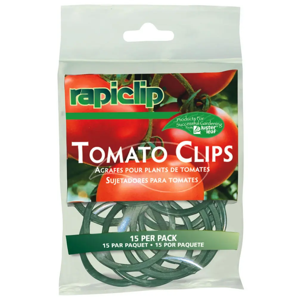 Green plastic clips for supporting tomatoes. 15 clips per package. Luster Leaf products are available for fall booking, inventory restocked once yearly.