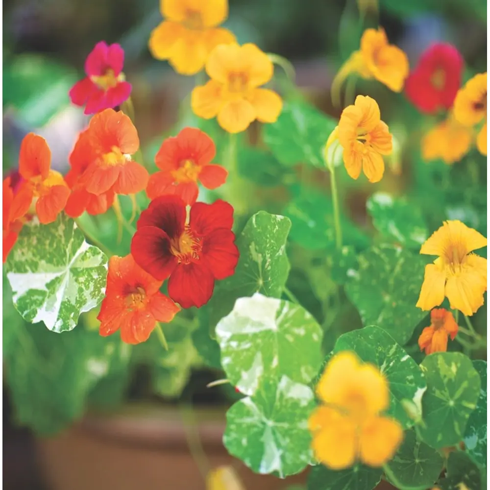 Foliage and flowers are edible and often tossed in salads to add a peppery flavour. A natural companion in the vegetable garden, trapping and discouraging harmful insects. The popular Alaska Mix is a mix of vibrant red, orange, gold, soft peach and apricot flowers that are held above the 30cm (12") high foliage. The unique leaves are bright green marbled with creamy white.