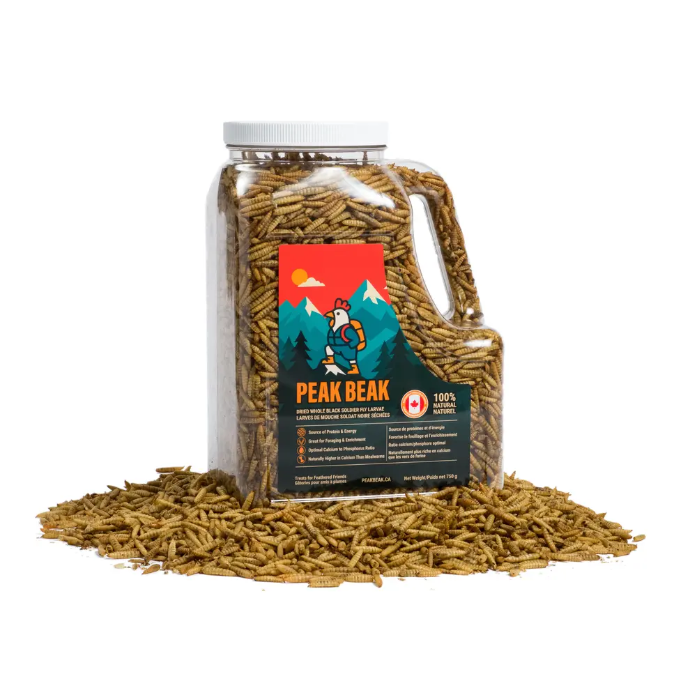 A natural, single-ingredient treat made from sustainably raised black soldier fly larvae. Peak Beak treats support overall flock health while encouraging natural foraging and enrichment behaviours. Produced in Canada on pre-consumer food waste, these larvae help divert greenhouse gases while delivering a highly palatable, protein-rich treat. Made with one simple ingredient – no fillers or additives.