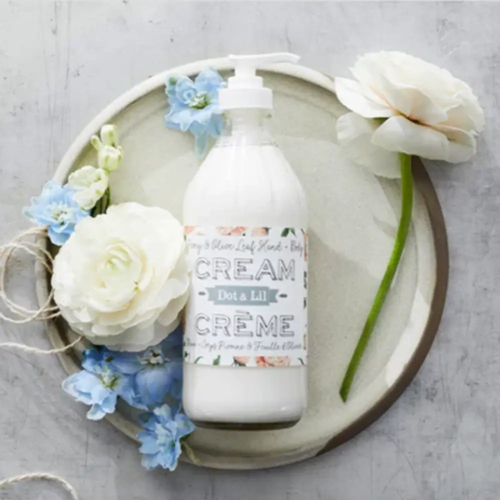 Dot & Lil hand + body cr?mes are made with a rich and emollient shea butter and coconut oil formula that deeply moisturizes and protects skin. An elegant glass bottle that matches our liquid soaps and milk baths. Comes with a beautiful gift tag with floral illustration. "For years we have been dreaming of the perfect peony fragrance, the classic queen of all flowers! After months of hard work to get it just right we are proud to introduce Peony & Olive Leaf, a blend of soft pink petals and elegant musk with lush fruit top notes. A clean and feminine spring scent with a hint of fresh green olive leaves carried on a warm breeze."