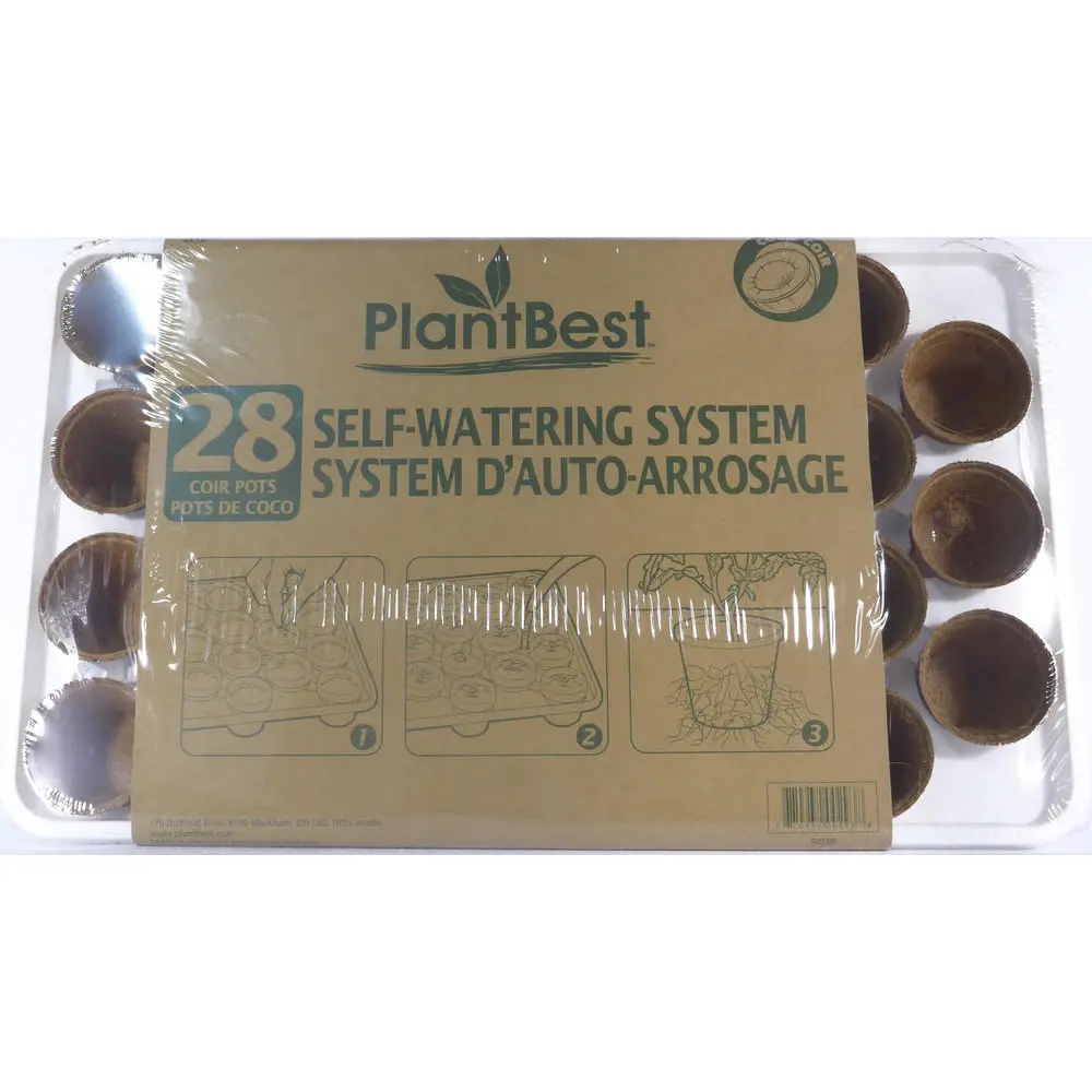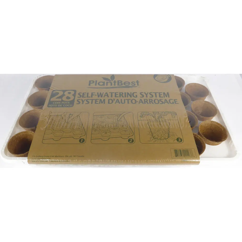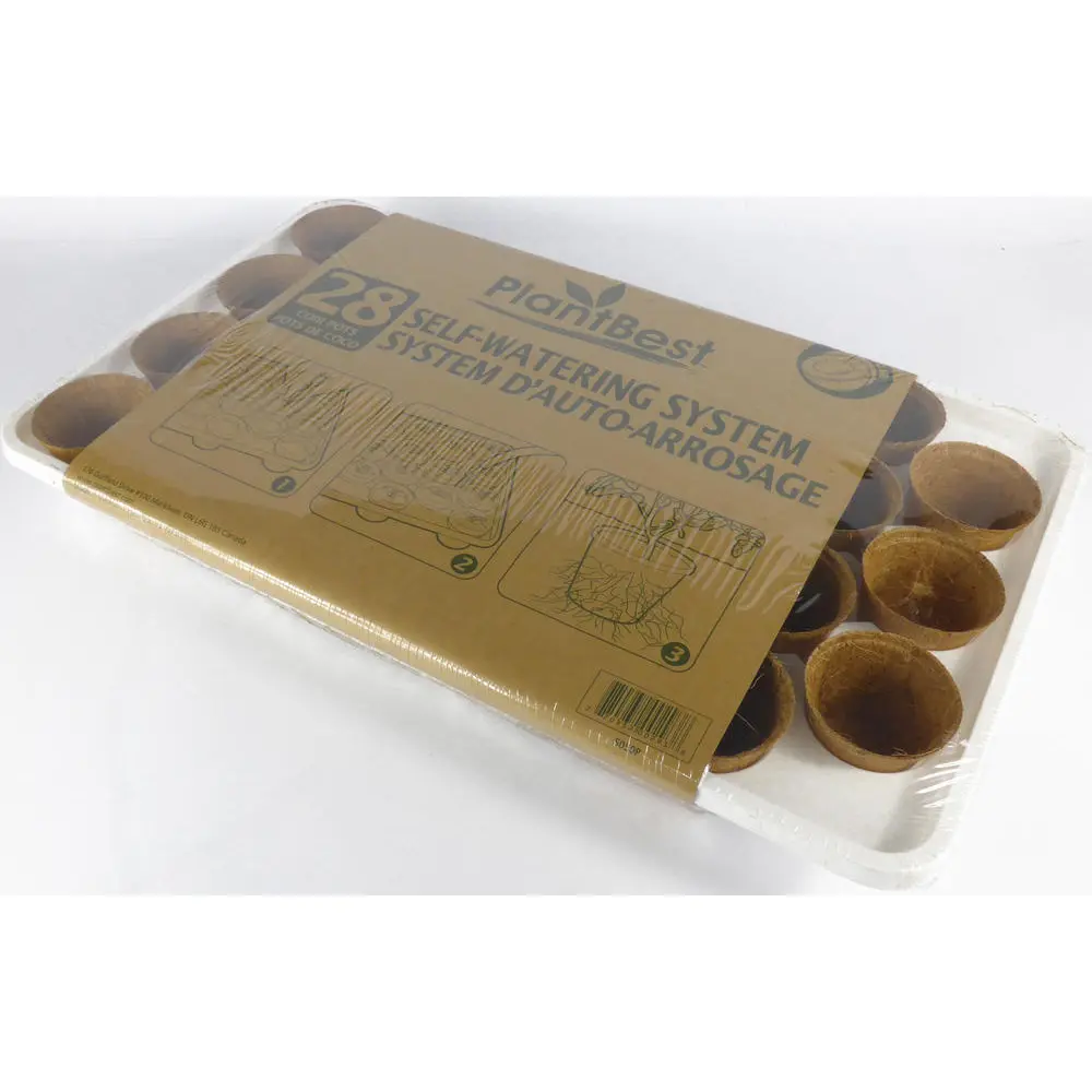 Kit contains 28 x 2.25" round coconut coir pots and a carrying tray to hold water and allow transplants to absorb water from the bottom. Dimensions: 12.5" x 20.5" x 2.6". Plant Best products are available for fall booking, inventory is restocked once yearly.