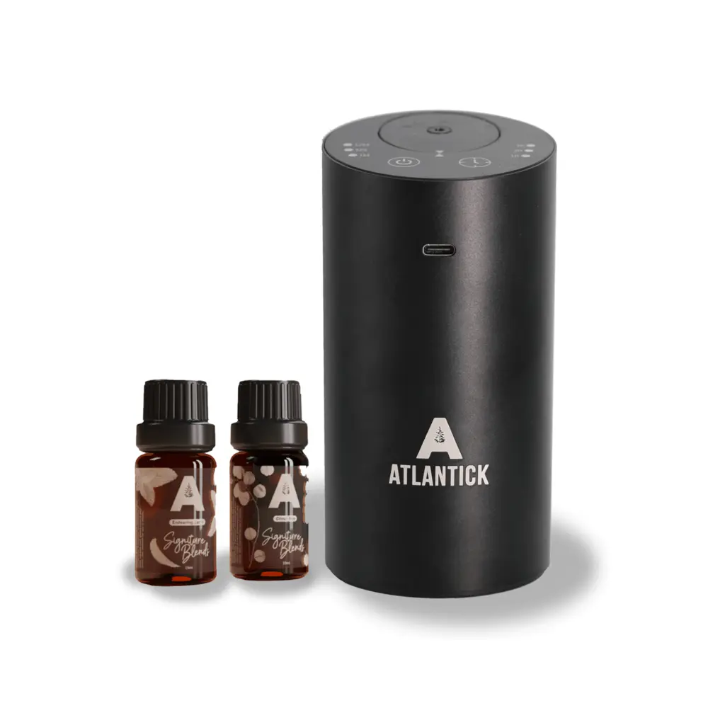 Ultrasonic Plate Technology: Efficient and quiet atomization. Spill-Proof and Rechargeable: USB powered with a long battery life (approx. 45 hours). Modern Design: Fits seamlessly into any setting. Programmable Settings: Customizable shut-off times and infusing intervals. Safe and Residue-Free: Suitable for pets, children, and furniture. Versatile: Compatible with 10ml, 15ml, and 20ml essential oil bottles. Includes Citrus Sun and Woodland Wanderer AtlanTick Signature Blends.