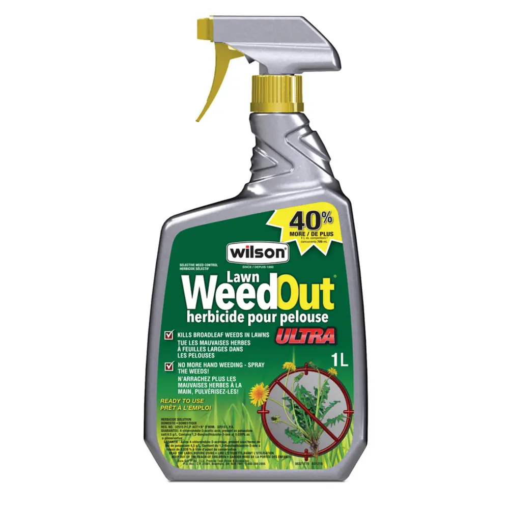 1L Lawn WeedOut Ultra Selective Weed Control Kills broad leaf weeds like dandelions, plantains and more. Visible results in as little as 24 hours with complete kill of the weed in 28 days. Ready to use formula. Apply only when weeds are actively growing. Apply when the minimum outdoor temperature is 15 degrees Celsius and the maximum outdoor temperature does not exceed 30 degrees Celsius. Do not apply if rainfall is expected within 4 hours after an application. Do not apply to dormant or drought stressed lawns.