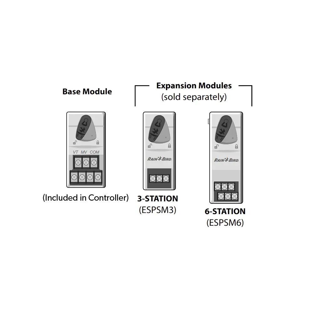 Optional Station Modules can be installed in the empty slots to the right of the Base Module to increase the station capacity up to 22 stations. 3-Station expansion module (ESPSM3) or 6-Station expansion module (ESPSM6) sold separately.