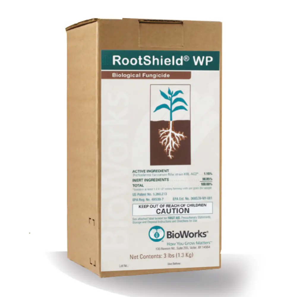 RootShield WP - Biological Fungicide Trichoderma harzianum Rifai strain KRL-AG2. For the suppression of root rot caused by Pythium spp., Rhizoctonia spp. and Fusarium spp. in greenhouse crops, outdoor nursery plants, greenhouse transplants, Ginseng, Hops, and Cannabis produced commercially indoors.
