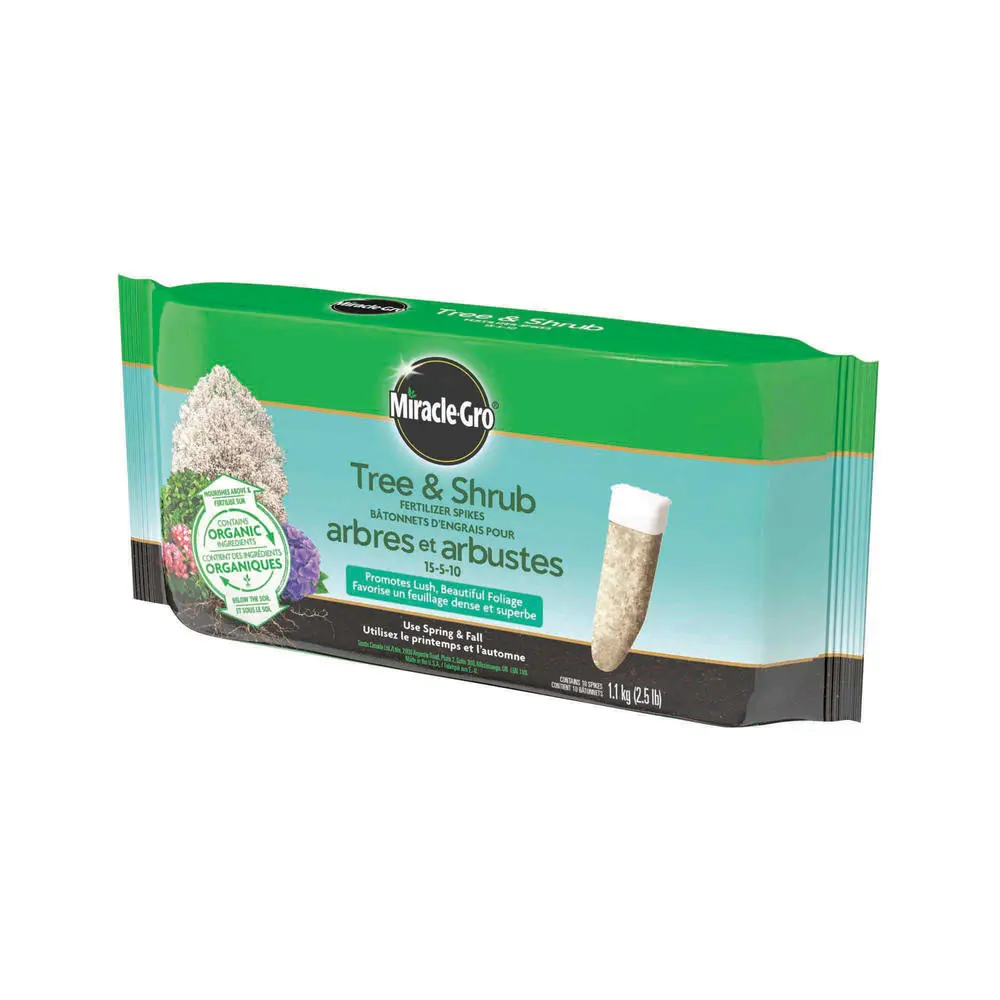 Get the best of both worlds with Miracle-Gro Tree & Shrub Plant Food Spikes 15-5-10. Easy feeding of your trees and shrubs, plus plentiful foliage and vibrant colour. These spikes are pre-measured, so they’re ready to use and easy to store. Each fertilizer spike contains essential nutrients and organic ingredients to nourish plants above the soil, and below the ground deep into the root zone. 10 spikes per package.