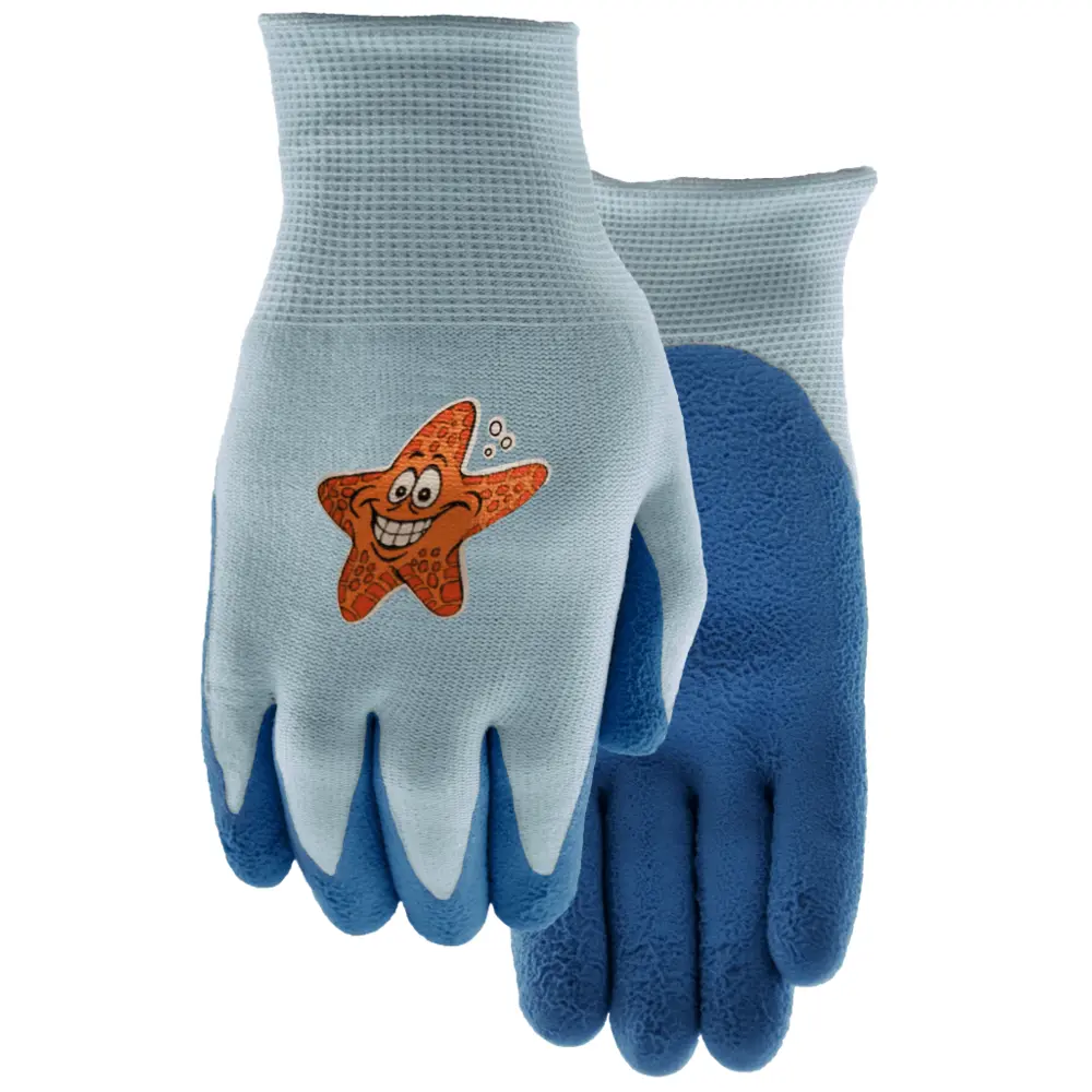 Nylon seamless knit, rubber crinkle latex coating. Snug-fitting knit wrist made for a kid’s hand.
