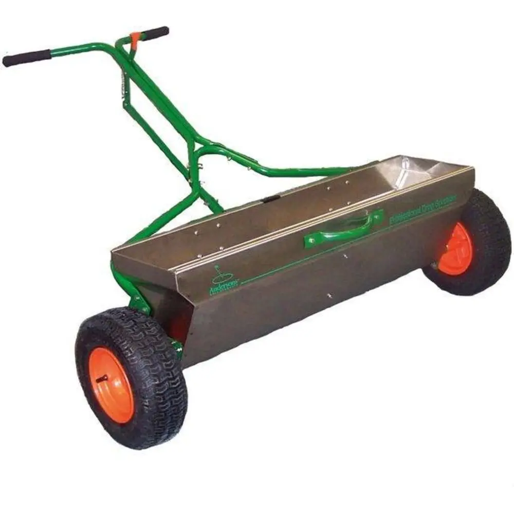 SSD Drop Spreader is a fertilizer spreader with high-quality stainless steel casing and pneumatic tires.