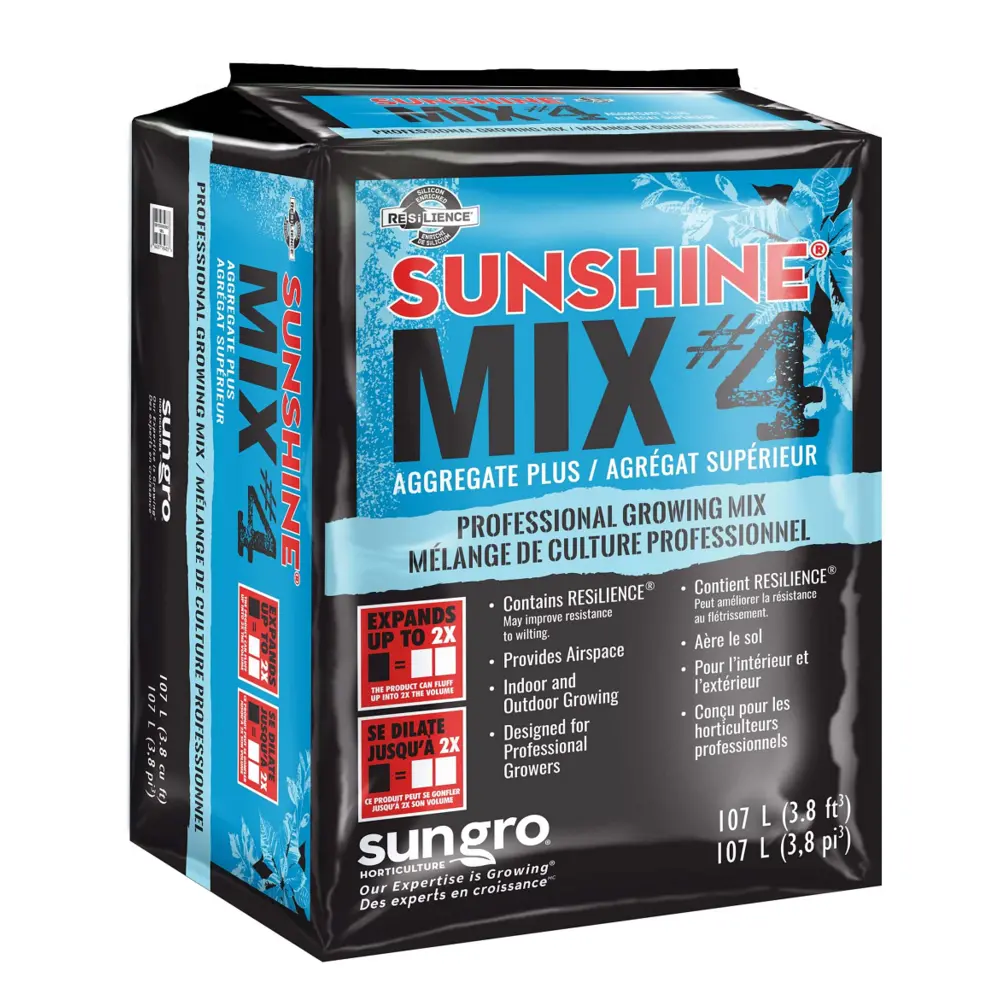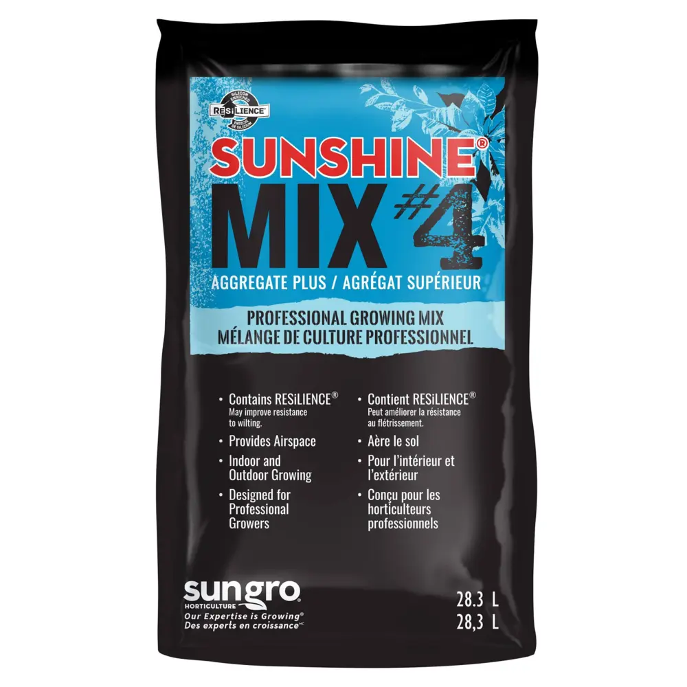 Sunshine Mix #4 RSI is Sun Gro's premium mix, formulated for indoor growing. It is recommended where high air capacity and fast drainage are needed: during winter months, with water and salt sensitive crops or where frequent leaching is required. Contains RESiLIENCE®, a beneficial plant substance that can make plants stronger and enhance quality.