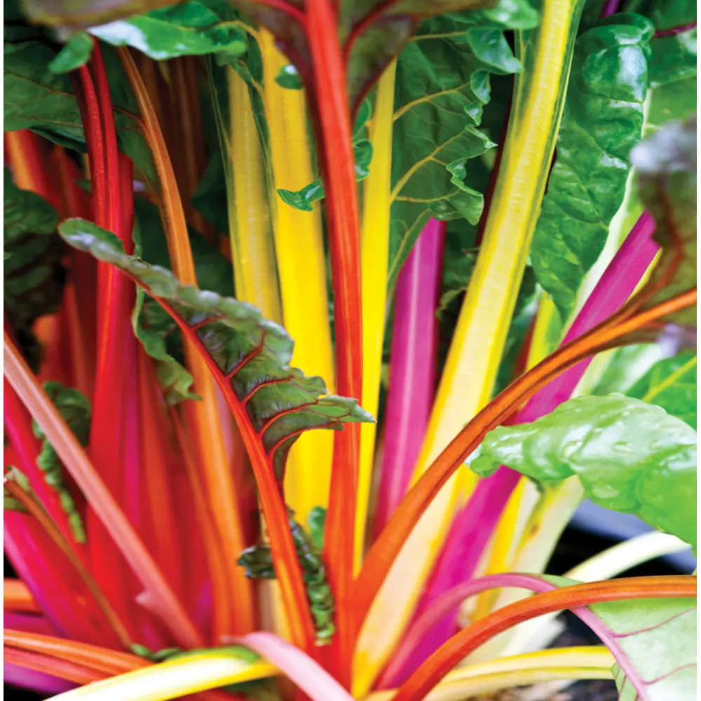 This rainbow coloured chard has stunning stems and veins in vivid shades of pink, orange, gold, purple, red and white. The lightly crumpled deep green leaves are extremely tasty and have a sweeter and milder flavour than most chards. Harvest leaves when 30cm (12") high. An All-American Selection (AAS) award winning variety.