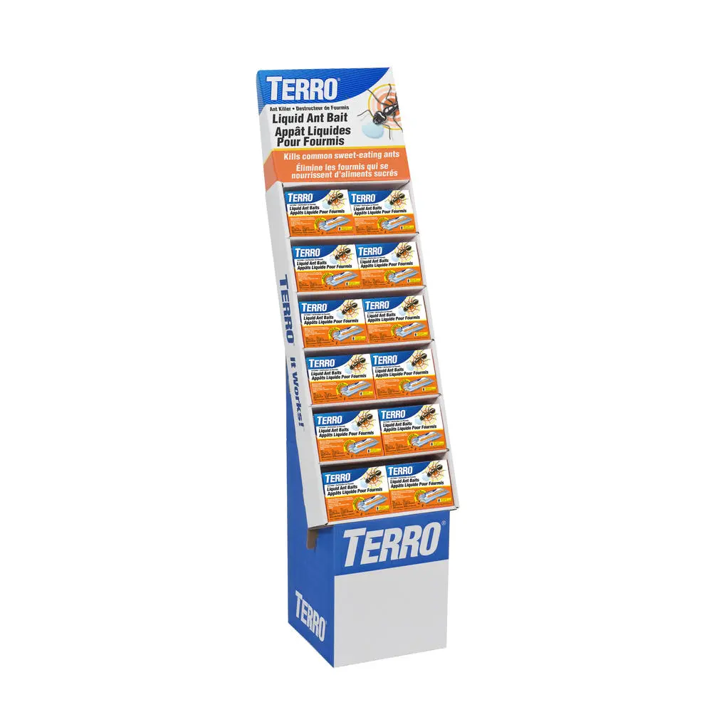 Display unit contains 48 Terro Outdoor Liquid Ant Bait. Woodstream Pest Control products are restocked once yearly, with pre-booking available in the fall.