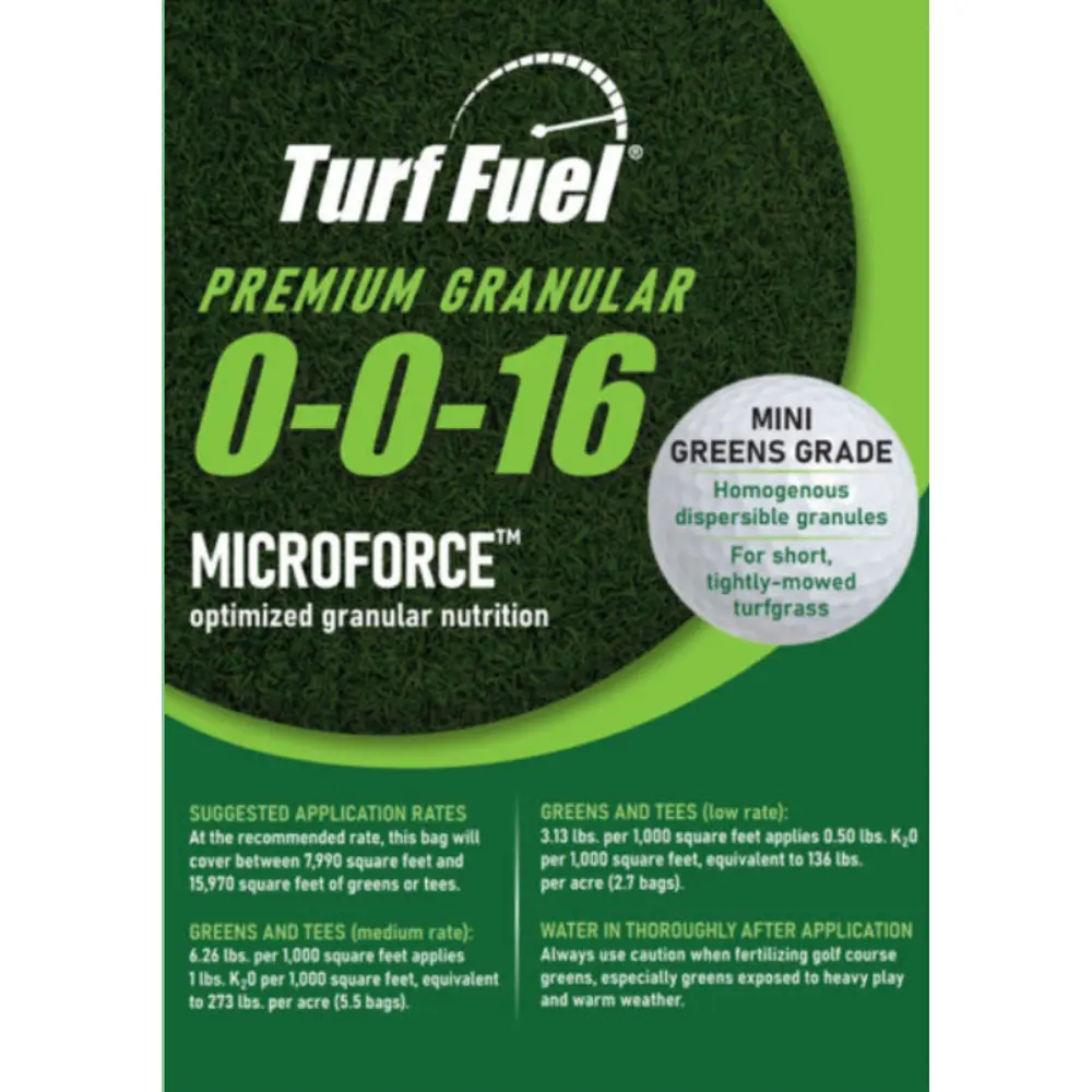 Turf Fuel’s dispensable granulated 0-0-16 contains Nutrifense technology, complexed amino acids, sea kelp, solar evaporated sulfate of potash, balanced micronutrients, and humic acid all in the best raw material forms available. Turf Fuel’s 0-0-16 strengthens the plant and conditions both soil and turf for the intense stress of a growing season. SGN: 75. Coverage: 8000sq.ft.