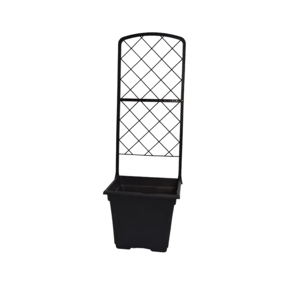 10" Black Square Trellis with Planter is an easy all-in-one pot and support system. Dimensions: 10" L x 8.27" W x 30.67" H. Volume: 2.15 gallons.