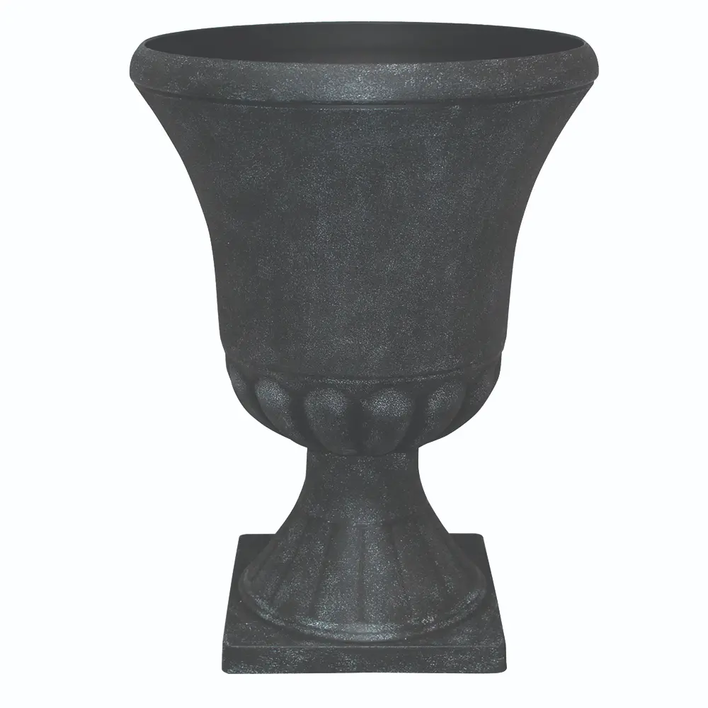 Resin and stone composite urn for an authentic look and feel. Black finish will enhance contrasting florals. UV protected urn pot increases resistance to cracking and fading.