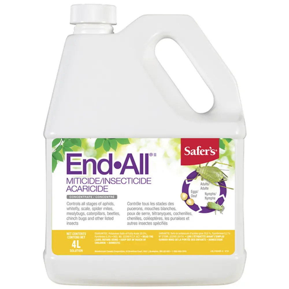 Safer's End-All concentrate insecticide is a product that effectively eliminates aphids, whiteflies, scales, spider mites, mealybugs, caterpillars, and other specified insects at any stage of development. It contains 20% of potassium salts of fatty acids and 0.2% of pyrethrins.